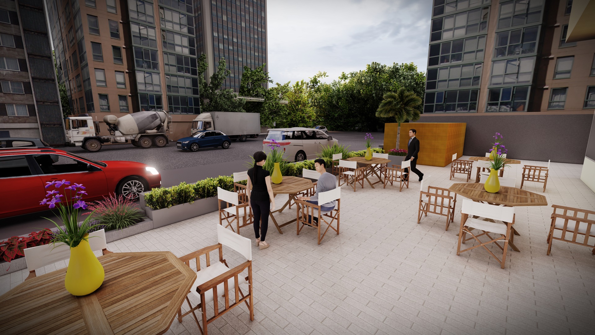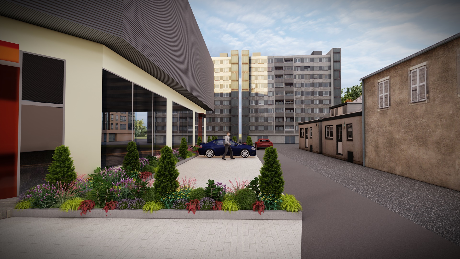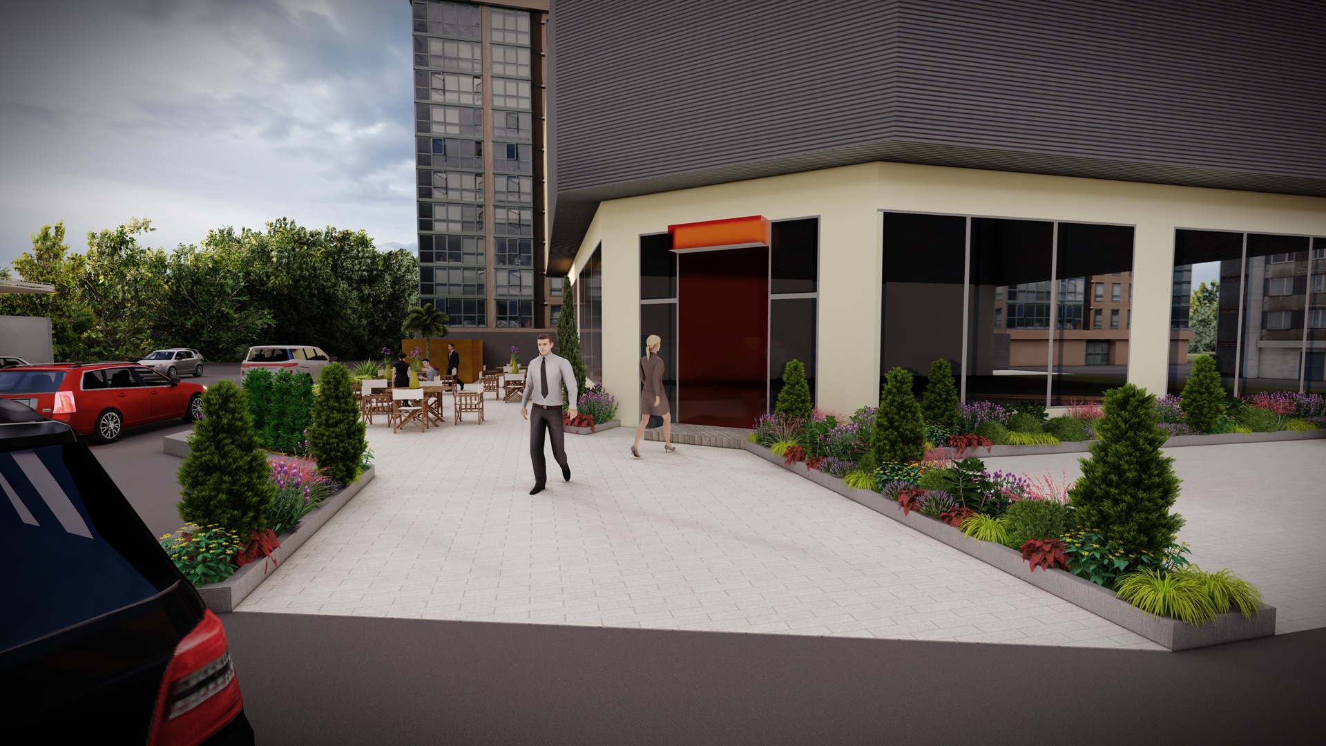 The store owned by Yatas Group is designed to include a customer reception patio and meticulous soft landscaping areas around the perimeter.
